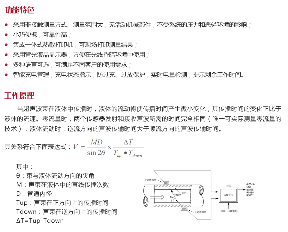 工作原理當超聲波束在液體中傳播時,液體的流動將使傳播時間產生微小變化,其傳播時間的變化正比于液體的流速。零流量時,兩個傳感器發(fā)射和接收聲波所需的時間完全相同(唯一可實際測量零流量的技術),液體流動時,逆流方向的聲波傳輸時間大于順流方向的聲波傳輸時間。