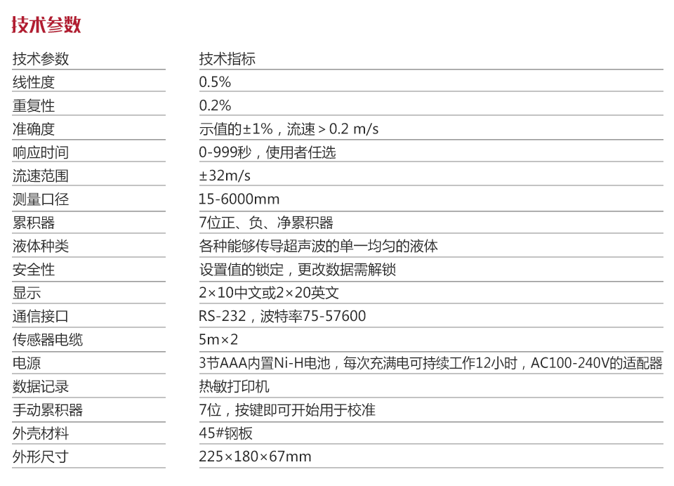 | 準確度 | 示值的±1%,流速>0.2 m/s |