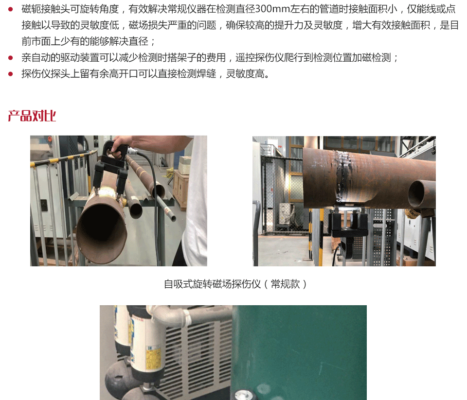 儀器特點? 創(chuàng)新自吸附功能設(shè)計,永磁吸附,8輪驅(qū)動,可轉(zhuǎn)向,自動爬行作業(yè),基于被檢測部件大都是懸空或垂直面的現(xiàn)狀,有效降低檢測人員手臂負擔、減輕勞動強度;