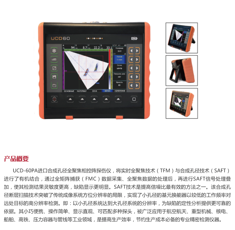 產(chǎn)品概述進(jìn)口UCD-60合成孔徑全聚焦相控陣檢測(cè)儀,實(shí)現(xiàn)全聚焦技術(shù)(TFM)與合成孔徑技術(shù)(SAFT)有機(jī)結(jié)合,合成孔徑斷層掃描技術(shù)方法突破了傳統(tǒng)成像系統(tǒng)方位分辨率的概念,實(shí)現(xiàn)了以小孔徑系統(tǒng)達(dá)到大孔徑系統(tǒng)的分辨率,檢測(cè)結(jié)果靈敏度更高,缺陷顯示更加明顯,為缺陷的定性分析提供更可靠的依據(jù)。其小巧便攜、操作簡(jiǎn)單、顯示直觀、可匹配多種傳感器,廣泛應(yīng)用于航空航天、重型機(jī)械、核電、船舶、高鐵、壓力容器與管線等工業(yè)領(lǐng)域,是提高生產(chǎn)效率,節(jié)約生產(chǎn)成本必備的專(zhuān)業(yè)精密檢測(cè)儀器。