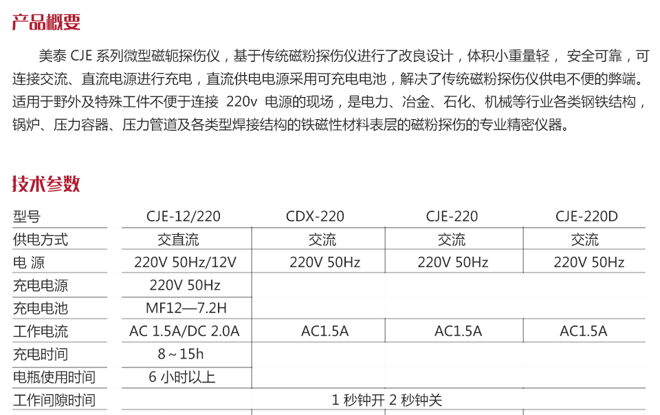 ? CJE-12/220 是交流電直流電兩用磁粉探傷儀,直流供電電源為充電電池,適用于野外及特殊工件不便于連接 220v 電源的現(xiàn)場;