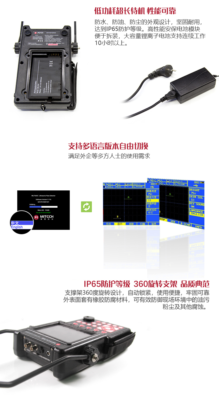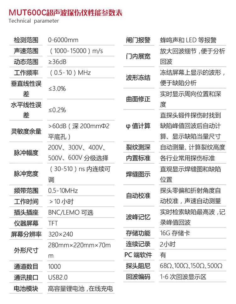產(chǎn)品概述MUT600C數(shù)字式超聲波探傷儀基于超聲傳播原理,可精準(zhǔn)、靈敏地進(jìn)行工件內(nèi)部多種缺陷(裂紋、夾雜、氣孔等)的檢測(cè)、定位、評(píng)估和診斷。采用全數(shù)字TFT 320×240真彩色液晶顯示屏,可根據(jù)環(huán)境選擇操作界面風(fēng)格,液晶亮度可調(diào)節(jié),界面設(shè)計(jì)人性化、波形顯示細(xì)膩;可全屏清晰發(fā)現(xiàn)缺陷;單手可把持操作,曲線制作、探頭校準(zhǔn)等操作均可自動(dòng)完成;既可用以用于實(shí)驗(yàn)室,也可以用于工程現(xiàn)場(chǎng)。0-6000mm普通量程可滿足制造業(yè)、鋼鐵冶金業(yè)、金屬加工也、化工業(yè)等常規(guī)的缺陷檢測(cè)需求,低功耗設(shè)計(jì)配備大容量高性能鋰離子電池模塊可連續(xù)工作10小時(shí)以上;質(zhì)優(yōu)價(jià)廉,是實(shí)用經(jīng)濟(jì)款超聲檢測(cè)儀器的首選。