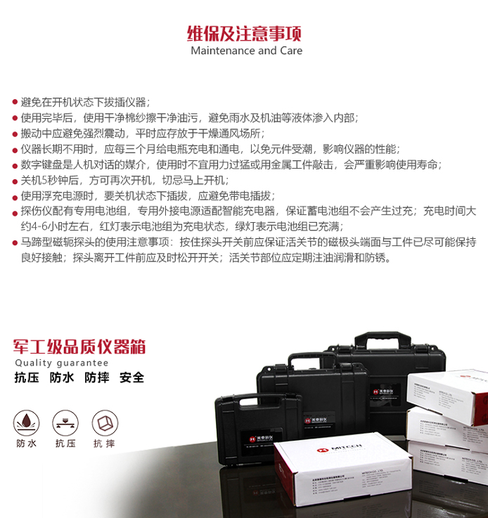 儀器的保養(yǎng)與維護(hù)數(shù)字便攜式磁粉探傷儀屬于精密檢測(cè)儀器,使用中要注意下列事項(xiàng):