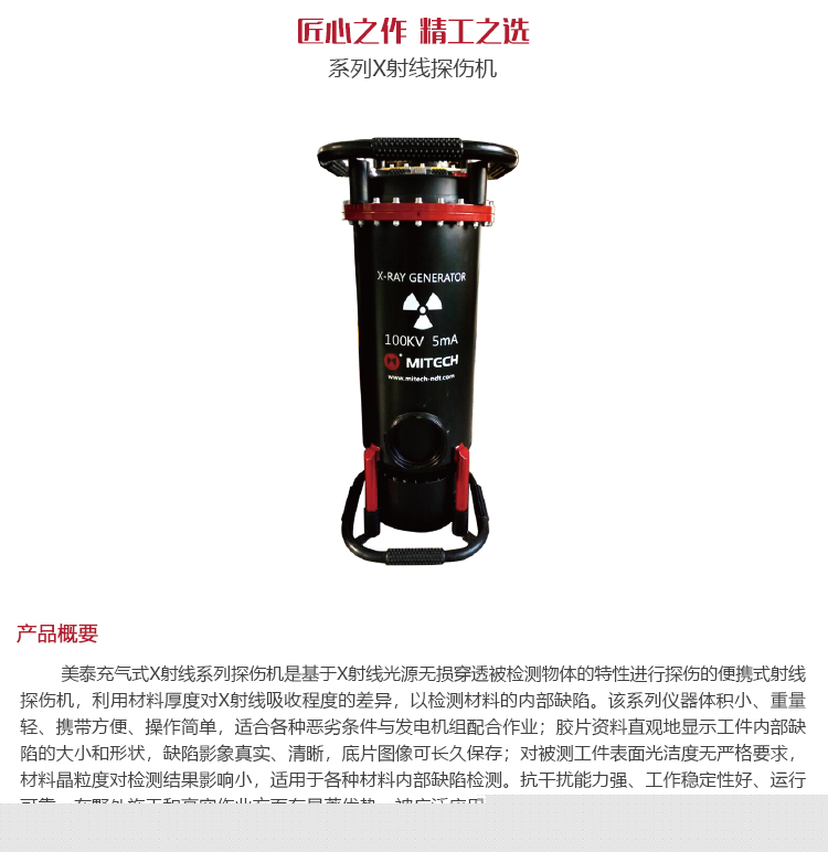 產(chǎn)品概述美泰XXQ-1605射線探傷儀是進(jìn)行X射線無損探傷的便攜式射線探傷機(jī),它利用材料厚度對X射線吸收程度的差異,以檢測材料的內(nèi)部缺陷。該系列儀器體積小、重量輕、攜帶方便、操作簡單,特別適合各種惡劣條件與發(fā)電機(jī)組配合作業(yè);底片可直觀地顯示工件內(nèi)部缺陷的大小和形狀,圖像可長久保存;體現(xiàn)在膠片上的缺陷影象真實、清晰;對被測工件表面光潔度無嚴(yán)格要求,材料晶粒度對檢測結(jié)果的影響小,適用于各種材料內(nèi)部缺陷檢測。該儀器干擾能力強(qiáng)、工作穩(wěn)定性好、運行可靠,特別適合野外施工和高空作業(yè),被廣泛應(yīng)用于造船、機(jī)械制造、航空、鐵路、壓力容器、鍋爐、石油、化工、國防工業(yè)等行業(yè),是進(jìn)行無損探傷的理想設(shè)備。