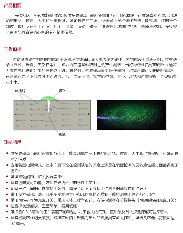 產(chǎn)品概述美泰CJX-A多功能磁粉探傷儀是我公司吸納國內(nèi)外同類產(chǎn)品的優(yōu)點(diǎn)自行設(shè)計(jì)生產(chǎn)的新型磁粉探傷儀器。它體積小、重量輕、操作便捷,集多款同類產(chǎn)品多項(xiàng)功能于一體。儀器可配A、D、O三種探頭,可實(shí)現(xiàn)磁鉗型探傷、電磁軛探傷、環(huán)型探傷三種探傷功能,是石油、化工、冶金、造船、航空、鐵路等領(lǐng)域缺陷檢測、質(zhì)量控制、在役安全監(jiān)測與壽命評估必備的專業(yè)精密儀器。