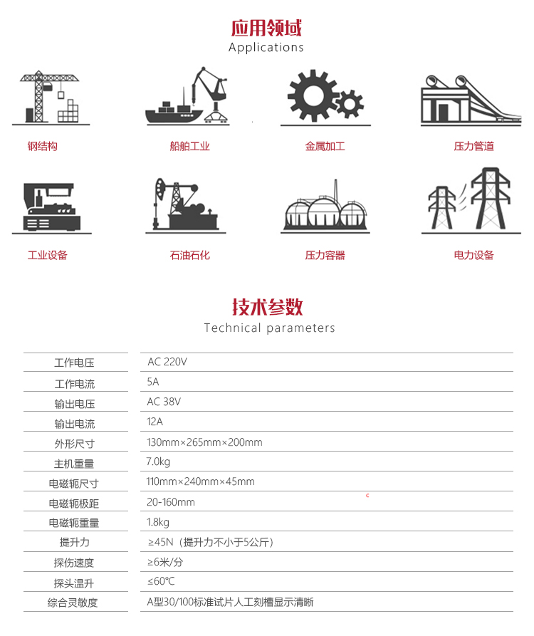 功能用途飛機(jī)制造、鍋爐壓力容器、電力、油田、造船、汽輪機(jī)和內(nèi)燃機(jī)配件、煤礦、機(jī)械、標(biāo)準(zhǔn)件、油泵油嘴、汽車零件、造橋、化工、鐵路、大型機(jī)械零部件、鋼結(jié)構(gòu)設(shè)備等行業(yè)產(chǎn)品;因鍛壓、淬火、焊接、疲勞等引起的表面及近表面缺陷,如鏈桿、曲軸、軸承、高強(qiáng)度螺栓、彈簧、鍛件、石化管件、閥門、葉片、齒輪、錨鏈以及焊縫等幾何形狀復(fù)雜的工件等。