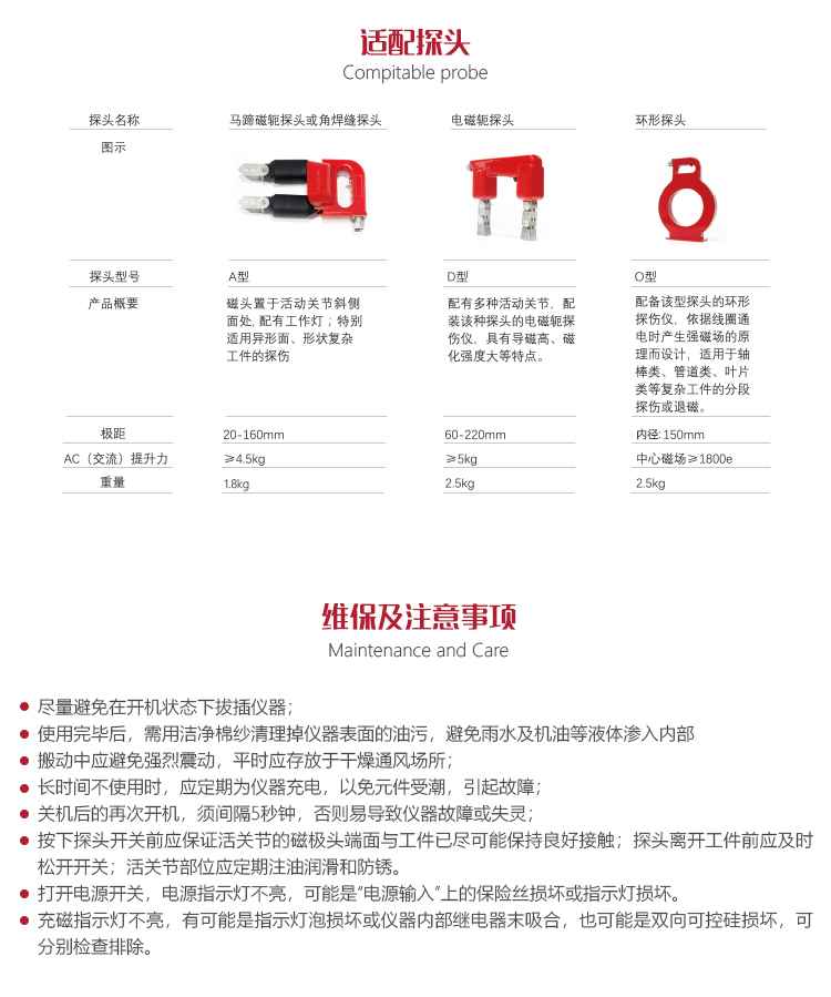 ?按下探頭開關(guān)前應(yīng)保證活關(guān)節(jié)的磁極頭端面與工件已盡可能保持良好接觸;探頭離開工件前應(yīng)及時(shí)松開開關(guān);活關(guān)節(jié)部位應(yīng)定期注油潤滑和防銹;