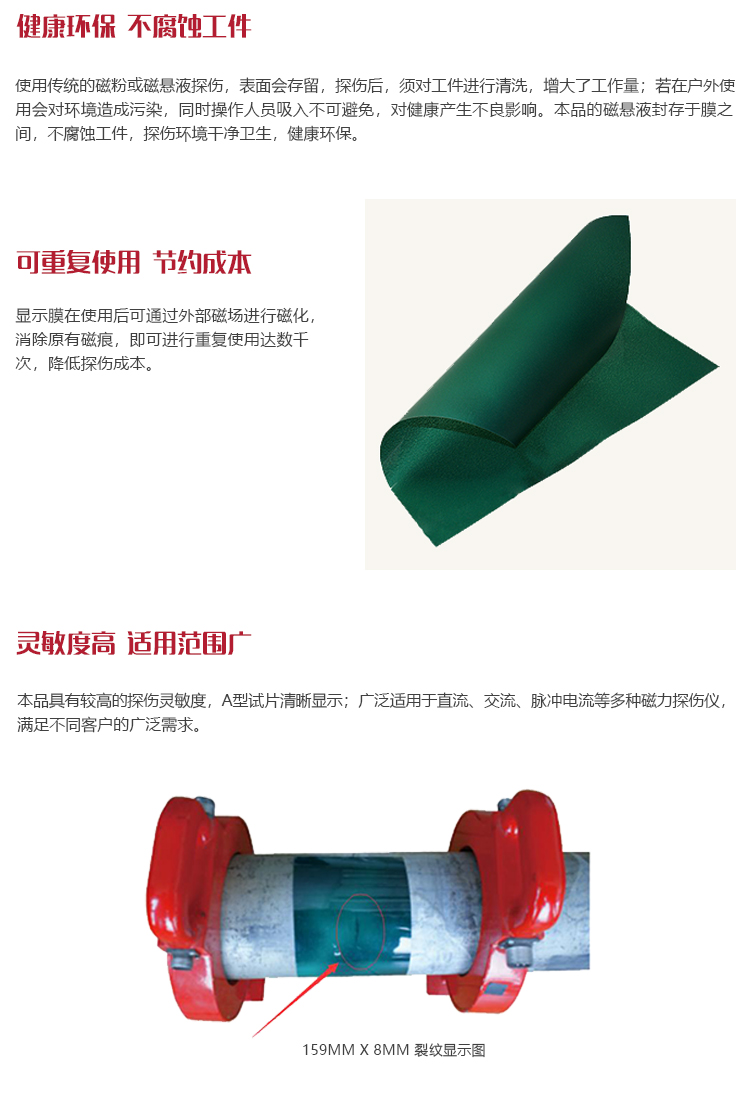 任意剪裁,可輕松貼合于工件表面,對(duì)于使用磁懸液和干磁粉不方便的觸達(dá)處(如容器立面或頂部),亦可輕松探傷;
