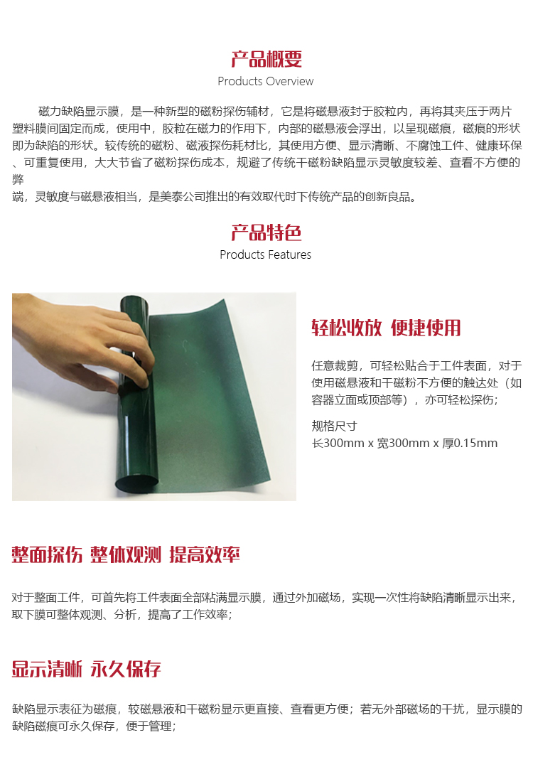 產(chǎn)品概述磁力缺陷顯示膜,是一種新型的磁粉探傷輔材,它是將磁懸液封于膠粒內(nèi),再將其夾壓于兩片塑料膜間固定而成,使用中,膠粒在磁力的作用下,內(nèi)部的磁懸液會(huì)浮出,以呈現(xiàn)磁痕,磁痕的形狀既為缺陷的形狀。較傳統(tǒng)的磁粉、磁粉探傷耗材比,其使用方便、顯示清晰、不腐蝕工件、健康環(huán)保、可重復(fù)使用,大大節(jié)省了磁粉探傷成本,規(guī)避了傳統(tǒng)干磁粉缺陷顯示靈敏度較差、查看不方便的弊端,靈敏度與磁懸液相當(dāng),是美泰公司推出的有效取代時(shí)下傳統(tǒng)產(chǎn)品的創(chuàng)新良品。