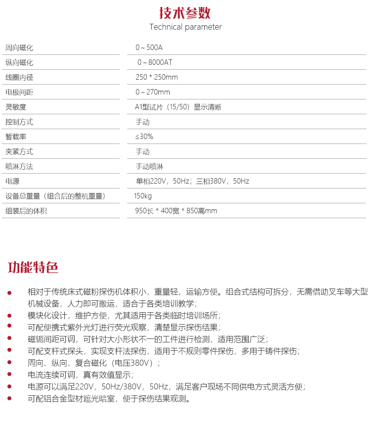 功能用途l 相對于傳統(tǒng)床式磁粉探傷機體積小,重量輕,運輸方便。組合式結(jié)構可拆分,無需借助叉車等大型機械設備,人力即可搬運,適合于各類培訓教學。