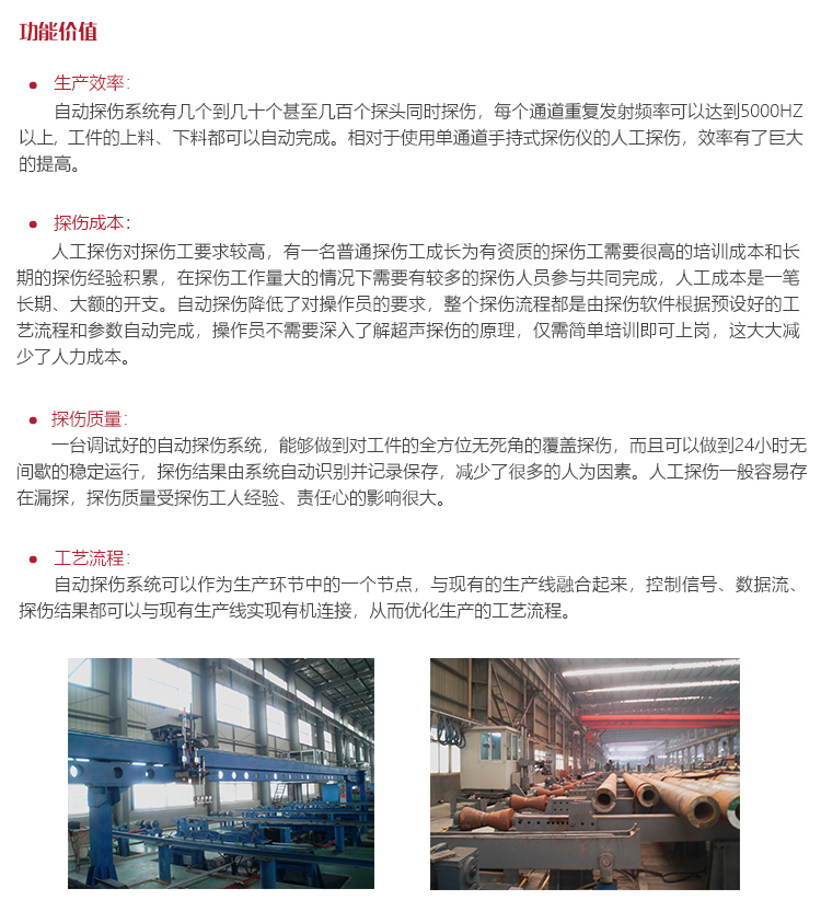 自動(dòng)探傷系統(tǒng)有幾個(gè)到幾十個(gè)甚至幾百個(gè)探頭同時(shí)探傷,每個(gè)通道重復(fù)發(fā)射頻率可以達(dá)到5000HZ以上, 工件的上料、下料都可以自動(dòng)完成。相對(duì)于使用單通道手持式探傷儀的人工探傷,效率有了巨大的提高。