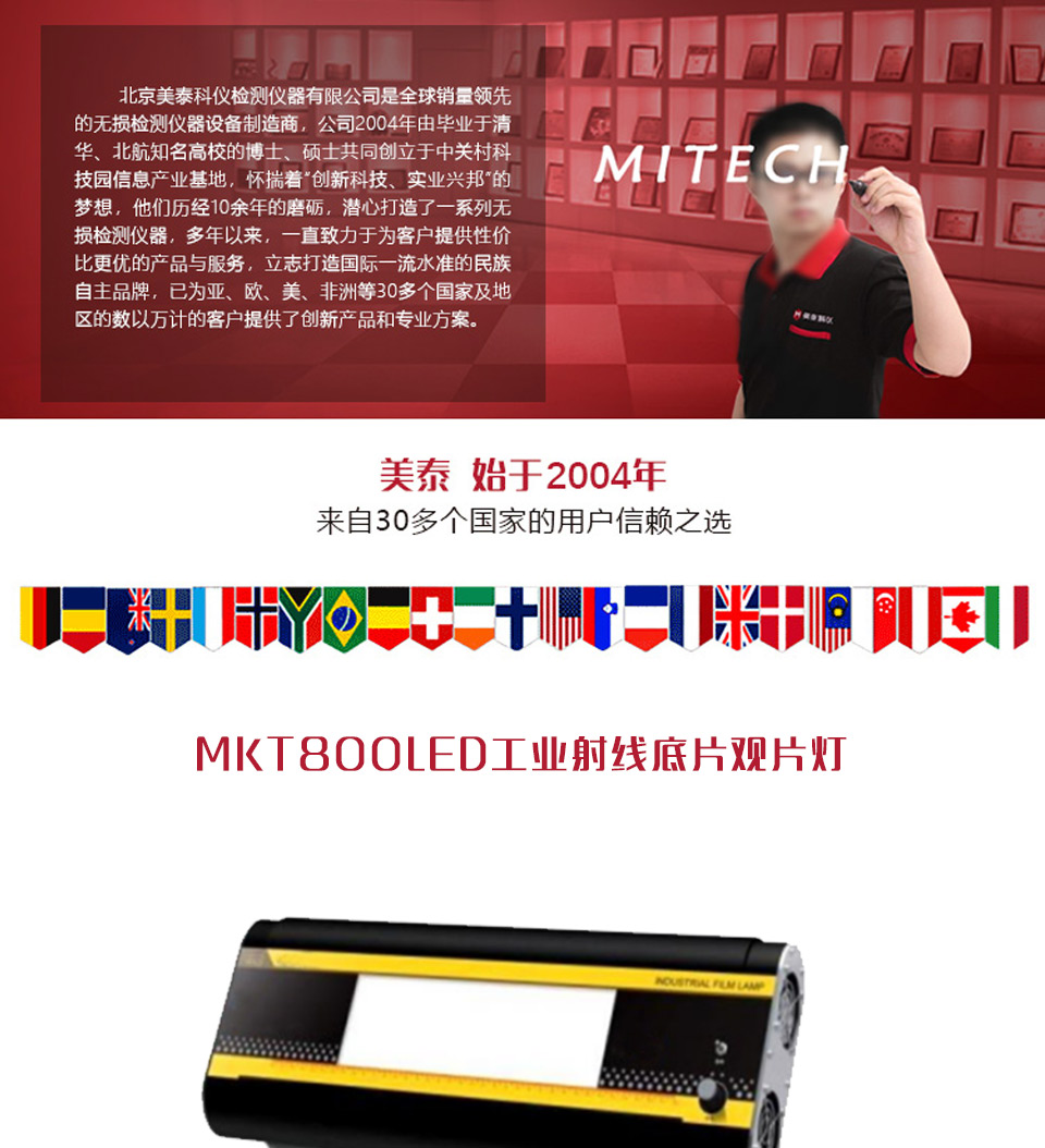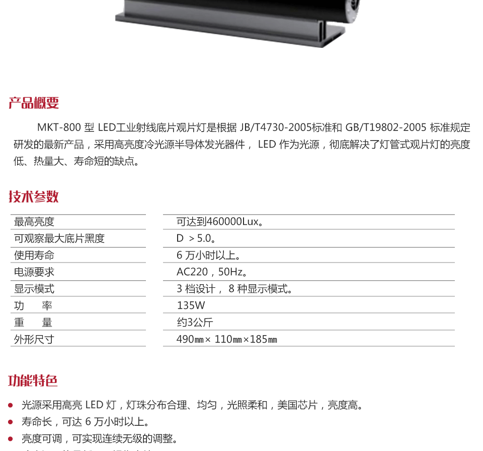 MKT-800 型 LED工業(yè)射線底片觀片燈是根據(jù) JB/T4730-2005標準和 GB/T19802-2005 標準規(guī)定研發(fā)的最新產(chǎn)品,采用高亮度冷光源半導體發(fā)光器件, LED 作為光源,徹底解決了燈管式觀片燈的亮度低、熱量大、壽命短的缺點。