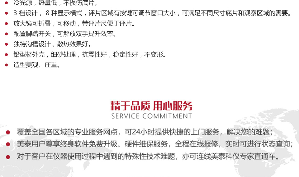 5、3 檔設計, 8 種顯示模式,評片區(qū)域有按鍵可調(diào)節(jié)窗口大小,可滿足不同尺寸底片和觀察區(qū)域的需要。