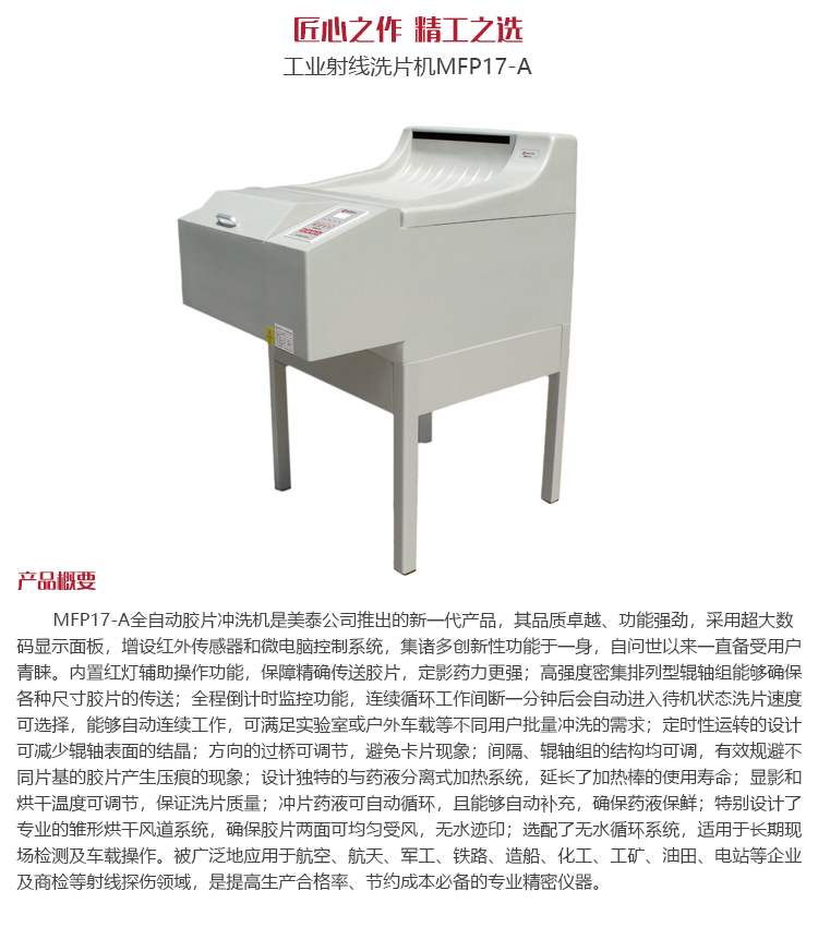 產(chǎn)品概述MFP17-A全自動膠片沖洗機是美泰公司推出的新一代產(chǎn)品,其品質(zhì)卓越、功能強勁,采用超大數(shù)碼顯示面板,增設(shè)紅外傳感器和微電腦控制系統(tǒng),集諸多創(chuàng)新性功能于一身,自問世以來一直倍受用戶青睞。內(nèi)置紅燈輔助操作功能,保障精確傳送膠片,定影藥力更強;高強度密集排列型輥軸組能夠確保各種尺寸膠片的傳送;全程倒計時監(jiān)控功能,使循環(huán)工作完成一分鐘自動進入待機狀態(tài);洗片速度可選擇,能夠自動連續(xù)工作,滿足實驗室或戶外車載等不同用戶批量沖洗的需求;定時性運轉(zhuǎn)的設(shè)計可減少輥軸表面的結(jié)晶;方向的過橋可調(diào)節(jié),避免卡片現(xiàn)象;間隔、輥軸組的結(jié)構(gòu)均可調(diào),有效規(guī)避不同片基的膠片產(chǎn)生壓痕的現(xiàn)象;設(shè)計獨特的與藥液分離式的加熱系統(tǒng),延長了加熱棒的使用壽命;顯影和烘干溫度可調(diào)節(jié),保證洗片質(zhì)量;沖片藥液可自動循環(huán),且能夠自動補充,確保藥液保鮮;特別設(shè)計了專業(yè)的雛形烘干風(fēng)道系統(tǒng),確保膠片兩面可均勻受風(fēng),無水跡??;選配無水循環(huán)系統(tǒng),適用于長期現(xiàn)場檢測及車載操作。被廣泛地應(yīng)用于航空、航天、軍工、鐵路、造船、化工、工礦、油田、電站等企業(yè)及商檢等射線探傷領(lǐng)域,是提高生產(chǎn)合格率、節(jié)約成本必備的專業(yè)精密儀器。