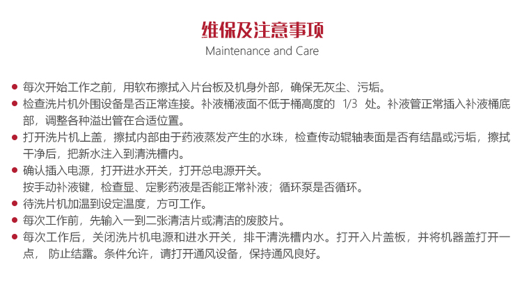 操作人員應(yīng)嚴格按照膠片沖洗規(guī)定,選用合格的高溫快顯機洗工業(yè)藥水。選用藥水應(yīng)在包裝處注明高溫快顯機洗標(biāo)志,配比要求請按照藥業(yè)廠家說明配比,膠片沖洗說明和藥液沖洗說明相吻合。我們建議,客戶應(yīng)選擇有溶液機洗說明的高溫快顯藥水。