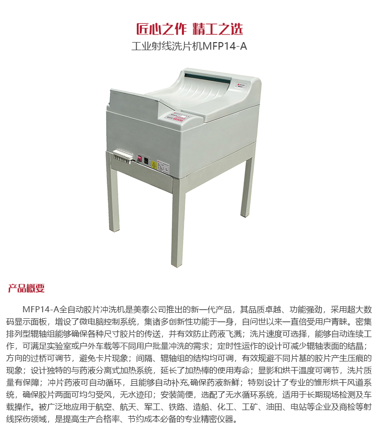 產(chǎn)品概述 MFP14-A全自動(dòng)膠片沖洗機(jī)是美泰公司推出的新一代產(chǎn)品,其品質(zhì)卓越、功能強(qiáng)勁,采用超大數(shù)碼顯示面板,增設(shè)了微電腦控制系統(tǒng),集諸多創(chuàng)新性功能于一身,自問(wèn)世以來(lái)一直倍受用戶(hù)青睞。密集排列型輥軸組能夠確保各種尺寸膠片的傳送,并有效防止藥液飛濺;洗片速度可選擇,能夠自動(dòng)連續(xù)工作,可滿(mǎn)足實(shí)驗(yàn)室或戶(hù)外車(chē)載等不同用戶(hù)批量沖洗的需求;定時(shí)性運(yùn)轉(zhuǎn)的設(shè)計(jì)可減少輥軸表面的結(jié)晶;方向的過(guò)橋可調(diào)節(jié),避免卡片現(xiàn)象;間隔、輥軸組的結(jié)構(gòu)均可調(diào),有效規(guī)避不同片基的膠片產(chǎn)生壓痕的現(xiàn)象;設(shè)計(jì)獨(dú)特的與藥液分離式加熱系統(tǒng),延長(zhǎng)了加熱棒的使用壽命;顯影和烘干溫度可調(diào)節(jié),洗片質(zhì)量有保障;沖片藥液可自動(dòng)循環(huán),且能夠自動(dòng)補(bǔ)充,確保藥液保鮮;特別設(shè)計(jì)了專(zhuān)業(yè)的雛形烘干風(fēng)道系統(tǒng),確保膠片兩面可均勻受風(fēng),無(wú)水跡??;安裝簡(jiǎn)便,選配了無(wú)水循環(huán)系統(tǒng),適用于長(zhǎng)期現(xiàn)場(chǎng)檢測(cè)及車(chē)載操作。被廣泛地應(yīng)用于航空、航天、軍工、鐵路、造船、化工、工礦、油田、電站等企業(yè)及商檢等射線(xiàn)探傷領(lǐng)域,是提高生產(chǎn)合格率、節(jié)約成本必備的專(zhuān)業(yè)精密儀器。