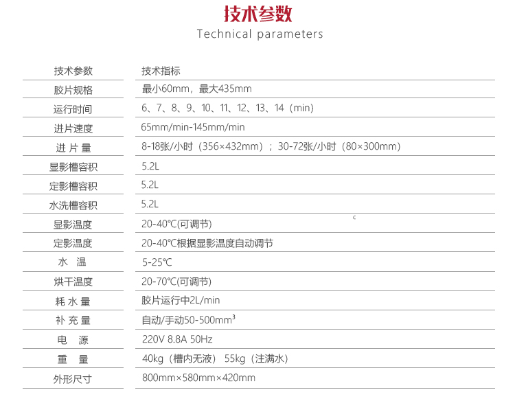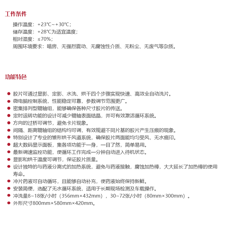 | 洗 片 量 | 8~18張/小時(shí)(356×432mm);30~72張/小時(shí)(80×300mm) |