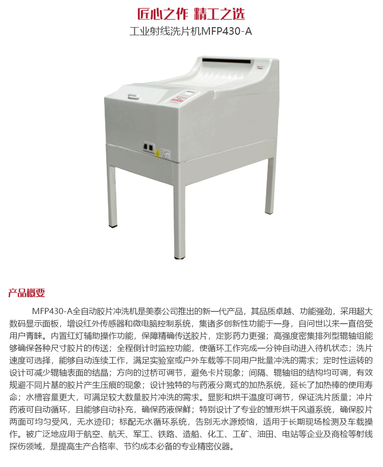 產(chǎn)品概述MFP430-A全自動膠片沖洗機(jī)是美泰公司推出的新一代產(chǎn)品,其品質(zhì)卓越、功能強(qiáng)勁,采用超大數(shù)碼顯示面板,增設(shè)紅外傳感器和微電腦控制系統(tǒng),集諸多創(chuàng)新性功能于一身,自問世以來一直倍受用戶青睞。內(nèi)置紅燈輔助操作功能,保障精確傳送膠片,定影藥力更強(qiáng);高強(qiáng)度密集排列型輥軸組能夠確保各種尺寸膠片的傳送;全程倒計時監(jiān)控功能,使循環(huán)工作完成一分鐘自動進(jìn)入待機(jī)狀態(tài);洗片速度可選擇,能夠自動連續(xù)工作,滿足實驗室或戶外車載等不同用戶批量沖洗的需求;定時性運轉(zhuǎn)的設(shè)計可減少輥軸表面的結(jié)晶;方向的過橋可調(diào)節(jié),避免卡片現(xiàn)象;間隔、輥軸組的結(jié)構(gòu)均可調(diào),有效規(guī)避不同片基的膠片產(chǎn)生壓痕的現(xiàn)象;設(shè)計獨特的與藥液分離式的加熱系統(tǒng),延長了加熱棒的使用壽命;水槽容量更大,可滿足較大數(shù)量膠片沖洗的需求。顯影和烘干溫度可調(diào)節(jié),保證洗片質(zhì)量;沖片藥液可自動循環(huán),且能夠自動補充,確保藥液保鮮;特別設(shè)計了專業(yè)的雛形烘干風(fēng)道系統(tǒng),確保膠片兩面可均勻受風(fēng),無水跡印;標(biāo)配無水循環(huán)系統(tǒng),告別無水源煩惱,適用于長期現(xiàn)場檢測及車載操作。被廣泛地應(yīng)用于航空、航天、軍工、鐵路、造船、化工、工礦、油田、電站等企業(yè)及商檢等射線探傷領(lǐng)域,是提高生產(chǎn)合格率、節(jié)約成本必備的專業(yè)精密儀器。
