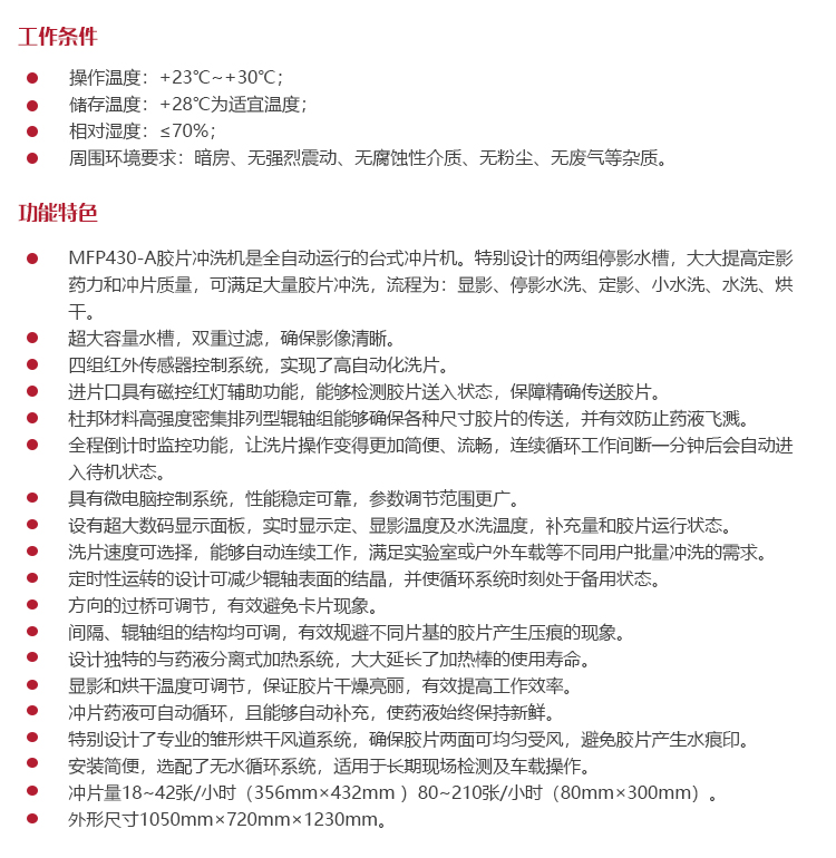 儀器特點MFP430-A膠片沖洗機(jī)是全自動運行的臺式?jīng)_片機(jī)。特別設(shè)計的兩組停影水槽,大大提高定影藥力和沖片質(zhì)量,可滿足大量膠片