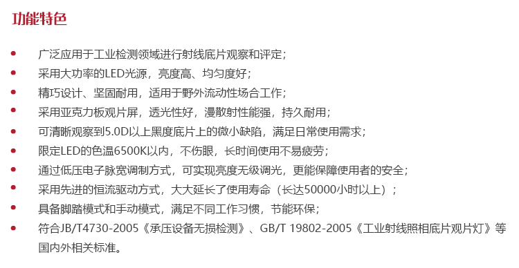 符合JB/T4730-2005《承壓設備無損檢測》、GB/T 19802-2005《工業(yè)射線照相底片觀片燈》等國內外相關標準。