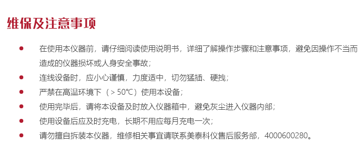 l 請勿擅自拆裝本儀器,維修相關(guān)事宜請聯(lián)系美泰科儀售后服務(wù)部,4000600280。