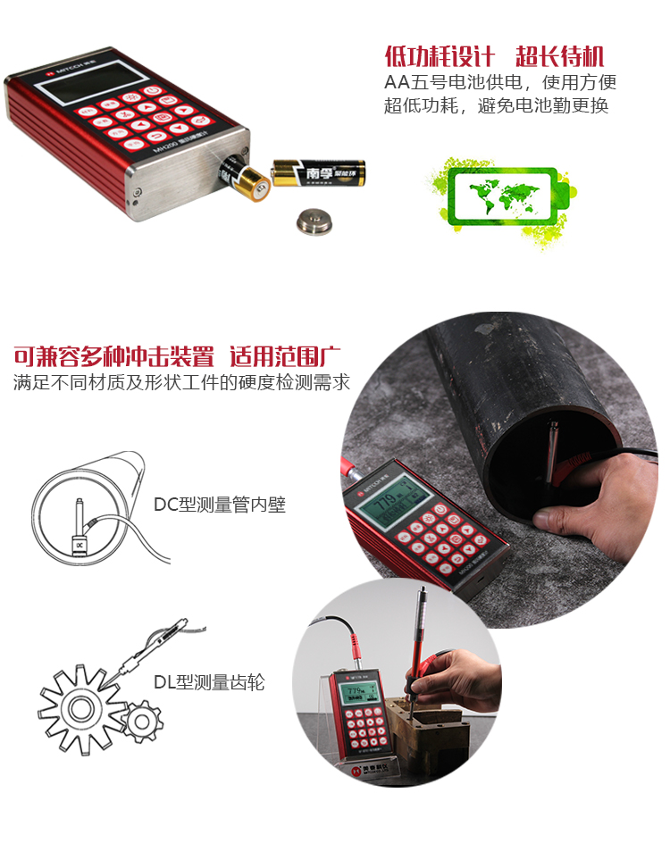 | 美泰便攜式里氏硬度計(jì)DL型沖擊裝置,高: 204 mm 重:50g 直徑:20mm,內(nèi)置DL沖擊體,前方為細(xì)長的裝置,適用于重量在5kg以上,厚度5mm以上,表面較光滑的狹小部位(孔內(nèi)、窄縫中)的工件硬度的測量。被廣泛的應(yīng)用于:已安裝的機(jī)械或永久性組裝的狹小部件;大型工件大范圍內(nèi)多處測量部位的快速檢驗(yàn);齒輪齒根等細(xì)長窄槽或孔內(nèi)??蓪?shí)現(xiàn)里氏、布氏、洛氏等硬度的精確測量。 | |