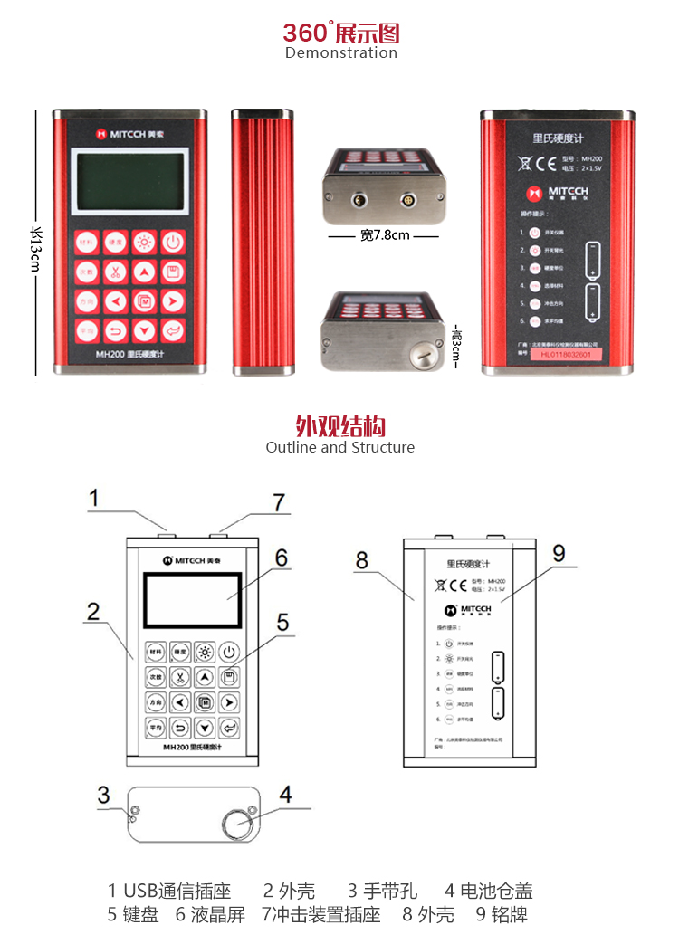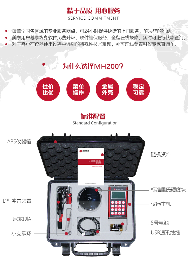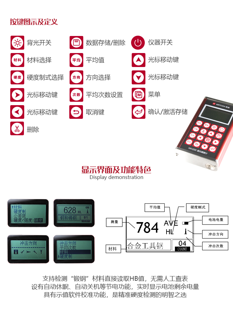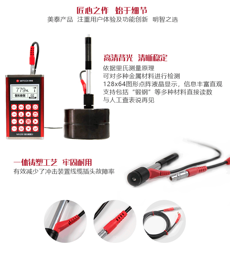 產(chǎn)品概述MH200便攜式里氏硬度計(jì),基于里氏硬度測量原理,可方便快捷地現(xiàn)場檢測多種金屬材料的硬度,支持里氏、布氏、洛氏等多種硬度制氏間的自由轉(zhuǎn)換。它采用國際流行的全封閉鋁美合金外殼,堅(jiān)固耐用,擁有強(qiáng)大的抗電磁、抗振動、抗干擾能力;低功耗設(shè)計(jì)依托穩(wěn)定的IC集成電路,性能可靠;全中文點(diǎn)陣液晶顯示,菜單式操作簡單快捷;支持PC機(jī)通訊及打印功能。被廣泛應(yīng)用于退火、回火、淬火熱處理工件的質(zhì)量控制;機(jī)床導(dǎo)軌、汽車底盤的硬度檢測;大型不可拆卸零部件的現(xiàn)場在役硬度測試;五金、鍛造、機(jī)床、特種鋼材的質(zhì)量檢測;批量生產(chǎn)過程中產(chǎn)品的質(zhì)量控制等,質(zhì)優(yōu)價(jià)廉,實(shí)用經(jīng)濟(jì),是硬度檢測常規(guī)需求的明智之選。